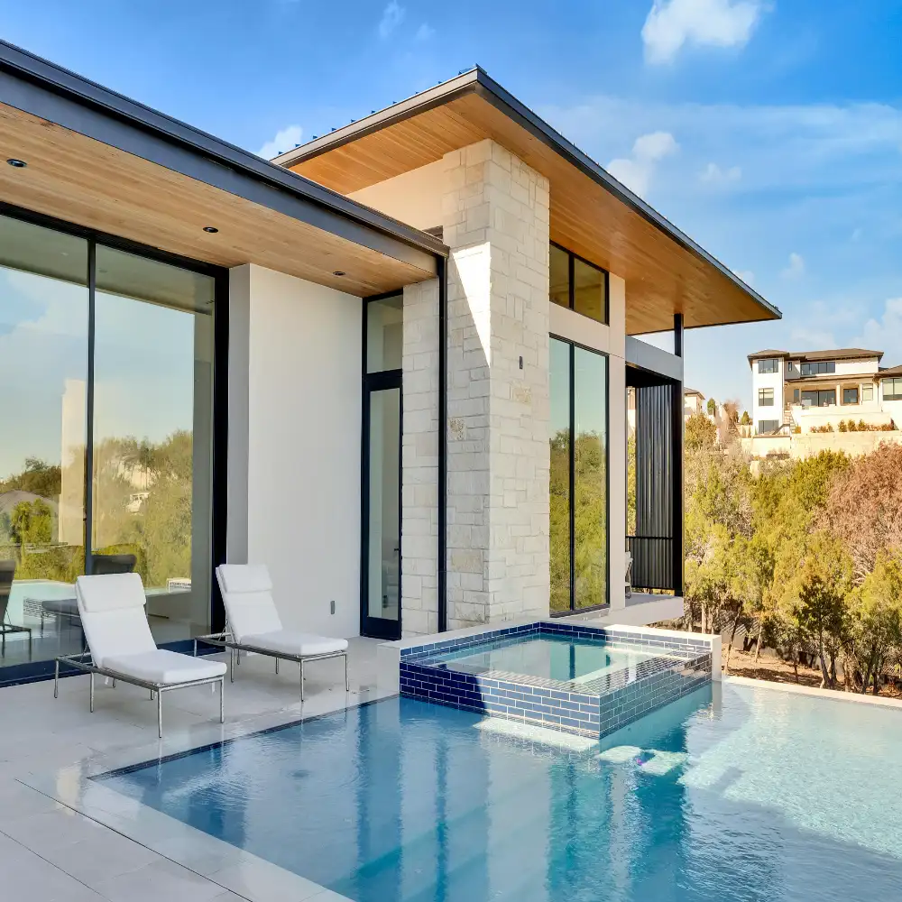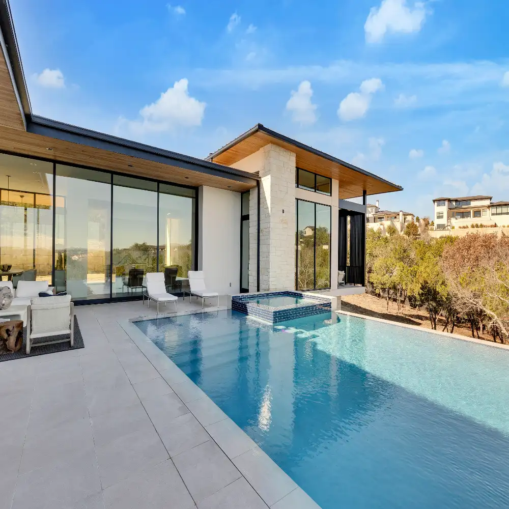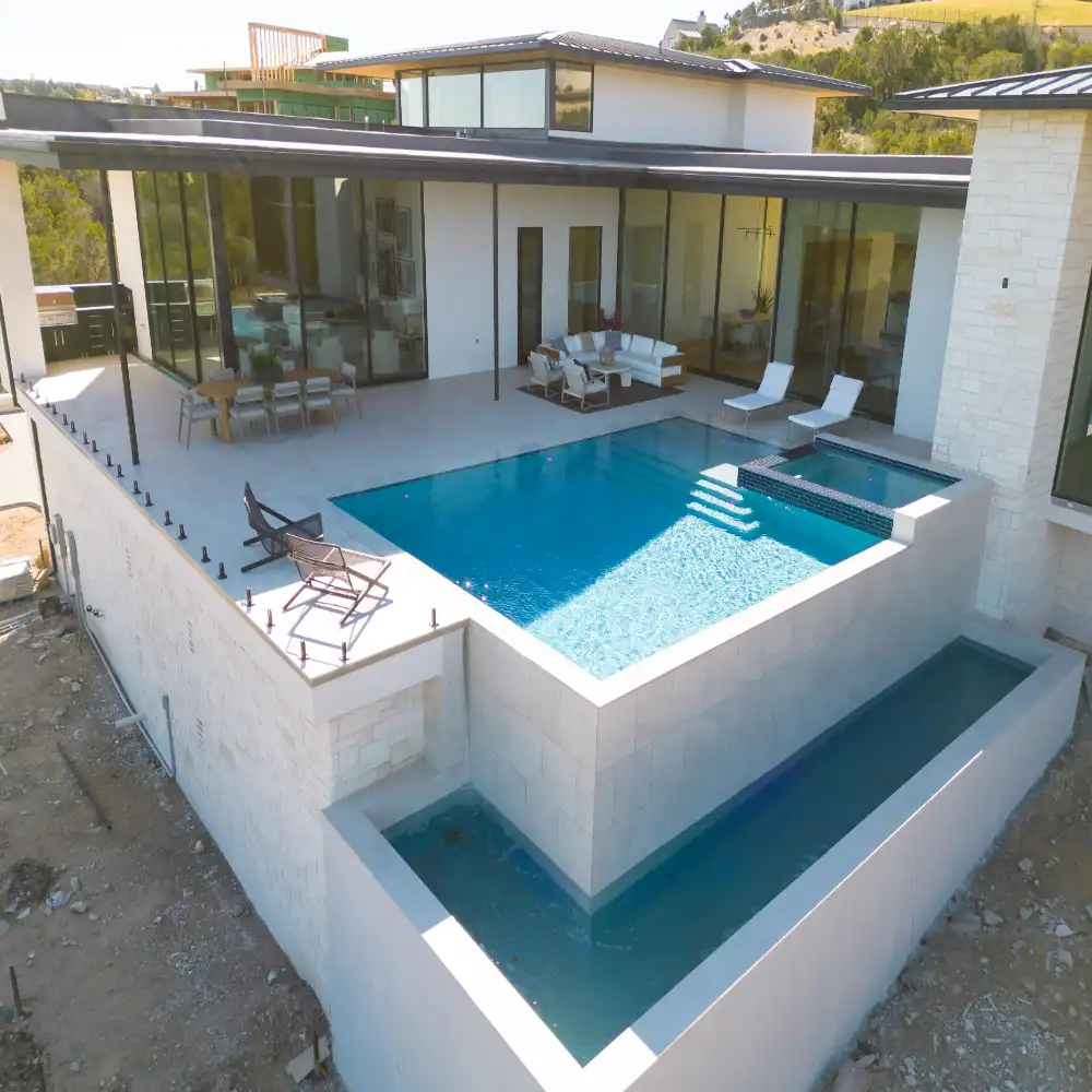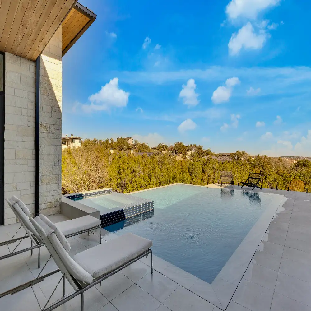 The Parismina pool is a striking modern infinity-edge design built for a hillside residence overlooking scenic Central Texas views. Its sleek geometric layout blends clean architectural lines with high-end finishes, creating a seamless transition between indoor and outdoor living. With the elevated structure, multi-tiered water features, and spa integration, this pool exemplifies sophisticated design and precision craftsmanship.