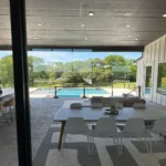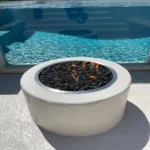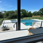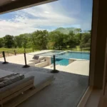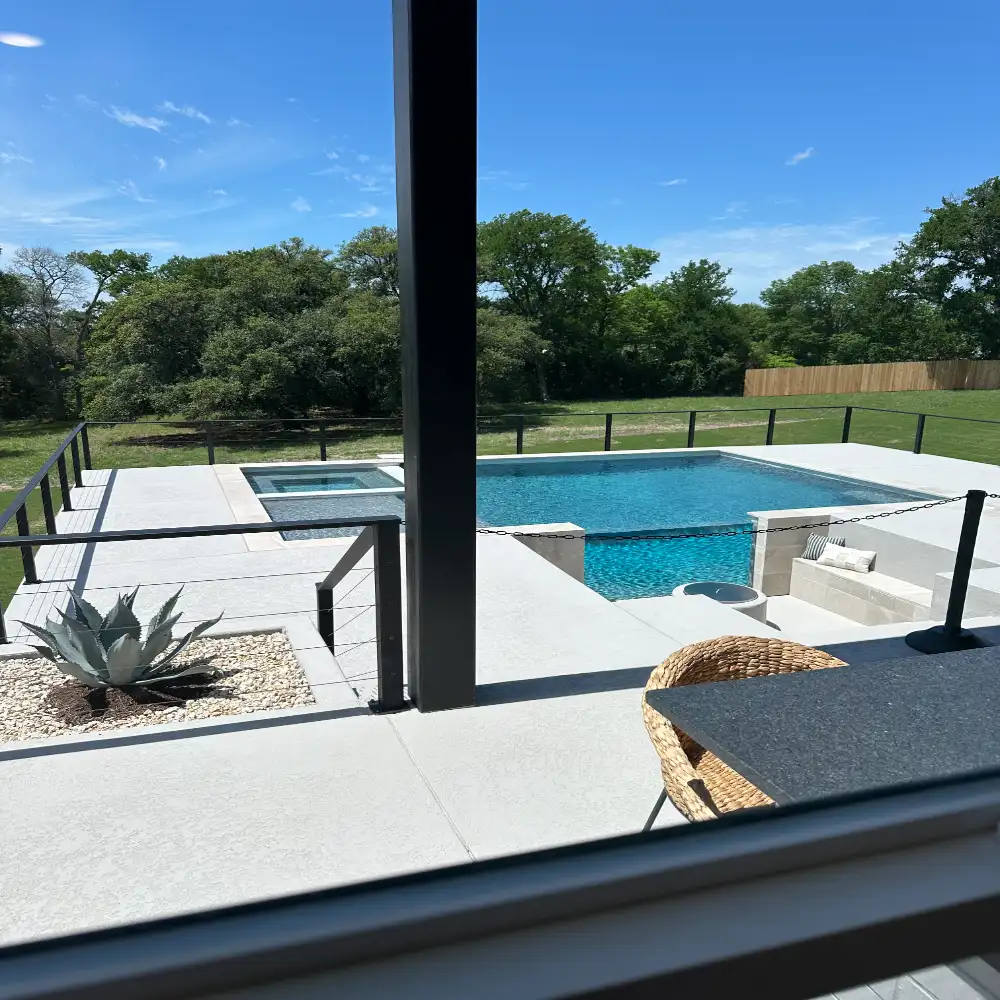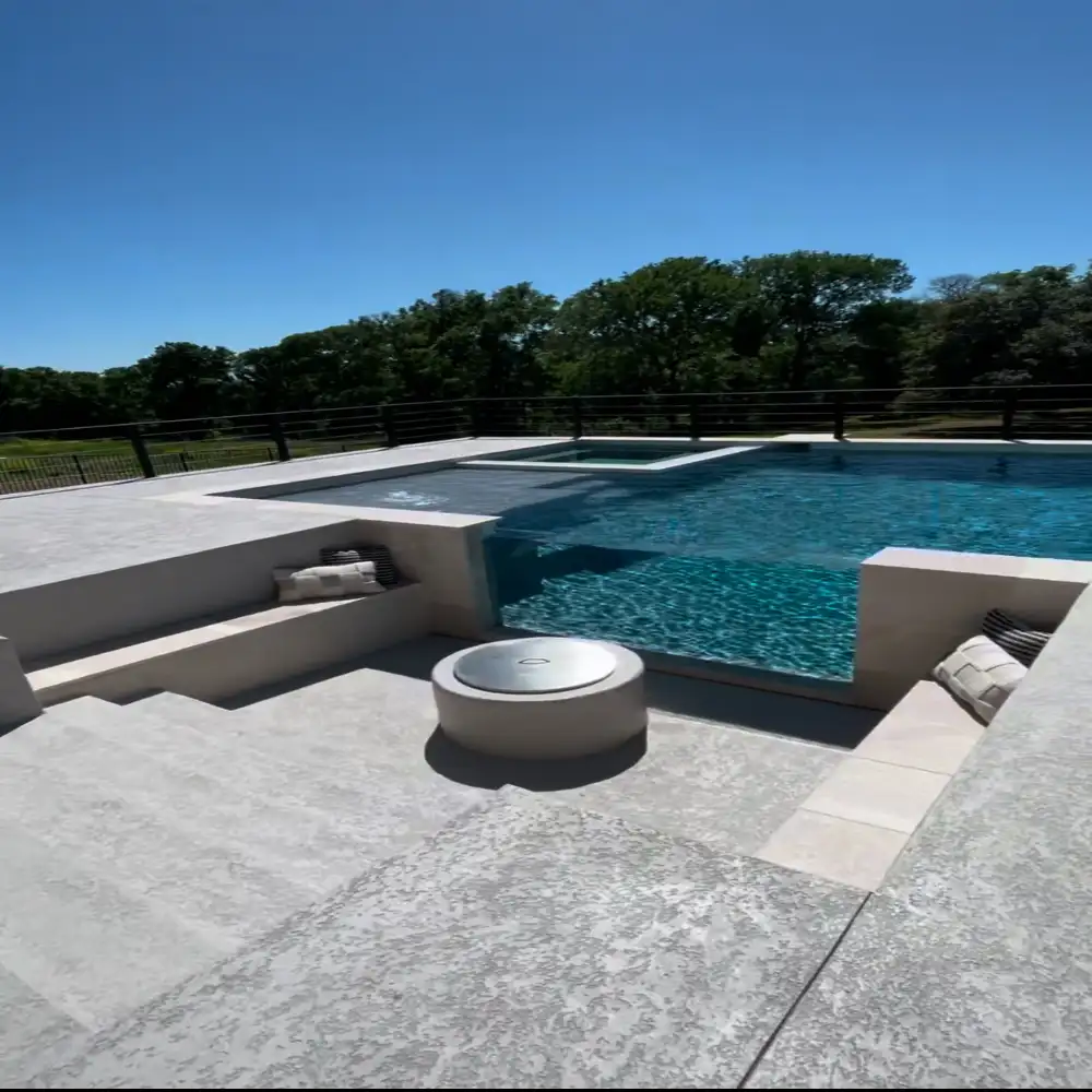 This modern architectural pool was custom-built for the 2024 Parade of Homes showcase, designed to embody luxury, symmetry, and seamless integration with indoor-outdoor living. With its elevated design and clean geometry, the pool creates a striking focal point while maintaining a timeless aesthetic. A built-in sunken lounge area with a circular fire feature offers a perfect gathering spot for both day and night, complemented by a glass wall that highlights craftsmanship and innovation. The open layout maximizes the surrounding green space and connects naturally to the home’s modern façade.