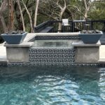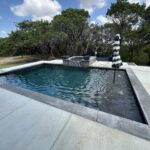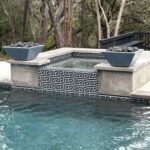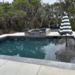 The Smith Pool combines modern lines with natural surroundings, creating a peaceful, elevated retreat tucked into the landscape. Its sleek geometric layout and dark pebble finish give the water a rich, reflective tone, while the raised spa becomes the centerpiece – finished with a bold patterned tile and flanked by contemporary fire bowls for dramatic effect. This design delivers a perfect blend of relaxation, ambiance, and clean architectural styling, ideal for evening entertaining or quiet afternoons by the water.