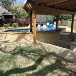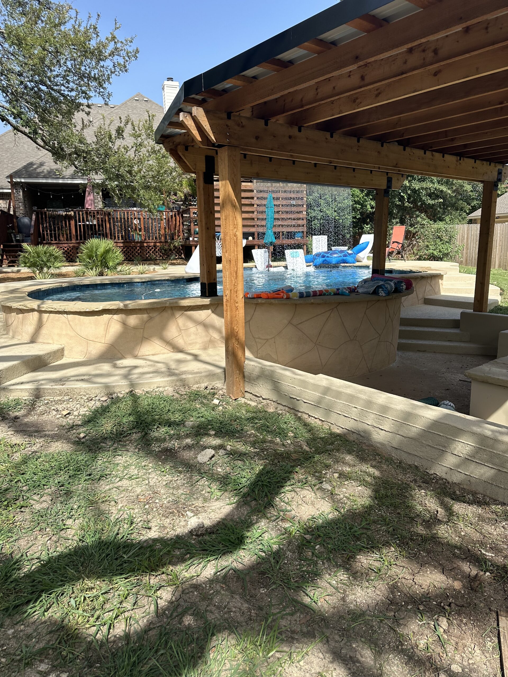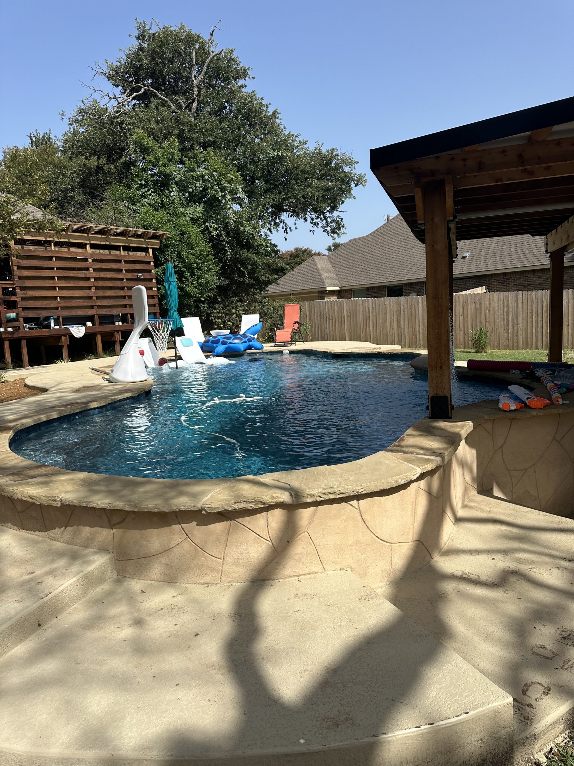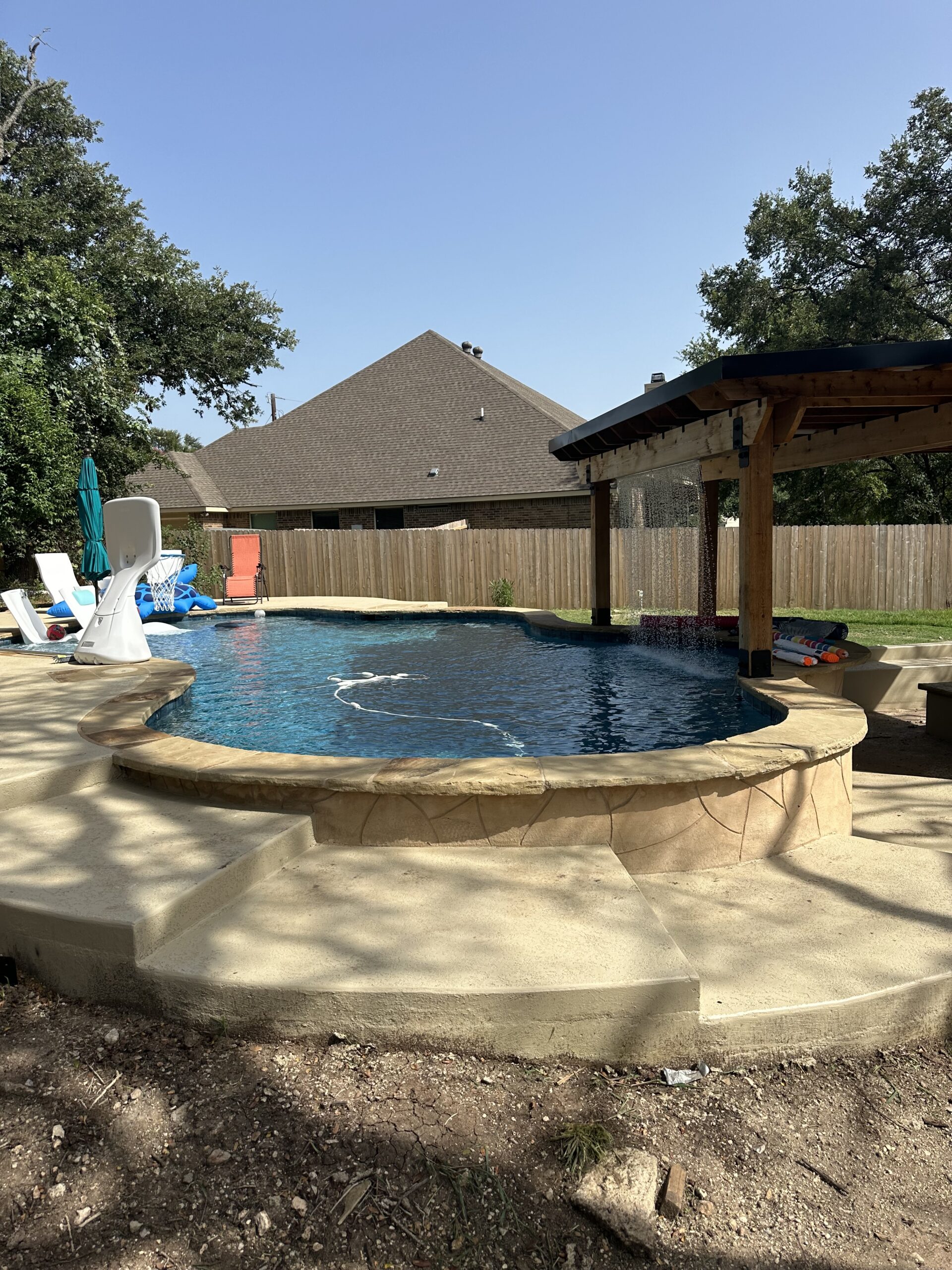 Tucked into a shaded backyard oasis, the Spring Canyon Pool is designed for both relaxation and entertainment. The natural stone finish and tranquil waterfall create a serene, resort-like atmosphere, while the custom pergola adds structure and comfort for outdoor living. The built-in seating area and modern fire feature make it perfect for hosting gatherings that carry on from sunny afternoons into cozy evenings by the water.