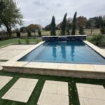 This modern, elevated cocktail pool design makes a stunning architectural statement, offering clean lines, symmetry, and a seamless connection with its surroundings. The raised structure creates a striking “infinity” feel while enhancing visibility of the elegant waterline tile and stacked stone veneer. Surrounded by lush artificial turf and precise stone pavers, this pool combines contemporary aesthetics with easy maintenance. The wide coping and level deck area make it perfect for lounging or entertaining while enjoying uninterrupted views of the landscape beyond.