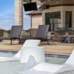 The raised spa with full mosaic tile detailing provides a luxurious focal point and an easy transition between lounging and soaking. A large tanning ledge with in-pool loungers and a bubbler adds a perfect space for sunbathing or family play. Dual sheer descents create gentle water movement and sound, bringing serenity to the entire space.