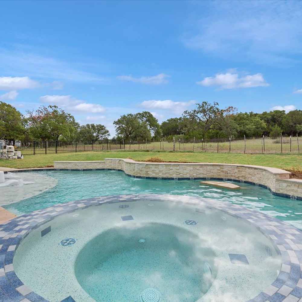 The raised spa with full mosaic tile detailing provides a luxurious focal point and an easy transition between lounging and soaking. A large tanning ledge with in-pool loungers and a bubbler adds a perfect space for sunbathing or family play. Dual sheer descents create gentle water movement and sound, bringing serenity to the entire space.
